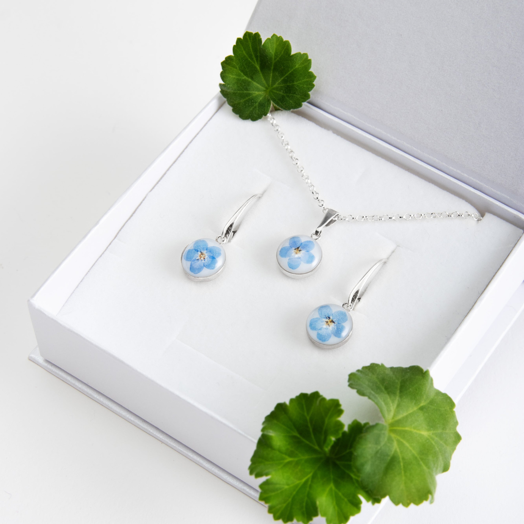 Pomněnková sada je součástí mojí stálé pomněnkové kolekce a přináší kousek přírody do každodenního života. Sada šperků obsahuje visací náušnice a náhrdelník, obojí se zalitými pravými pomněnkami, které sama sbírám a suším. Pomněnky, symbolizující pravou lásku a vzpomínky, jsou ideální jak pro každodenní nošení, tak pro speciální příležitosti. Každý kus je pečlivě vyroben z kvalitního stříbra Ag 925/1000 a rhodiován, což zajišťuje nejen odolnost a dlouhou životnost, ale i nádherný lesk, který dodává šperkům luxusní vzhled. Co činí tuto sadu unikátní, je její kombinace minimalistického designu s romantickým nádechem.